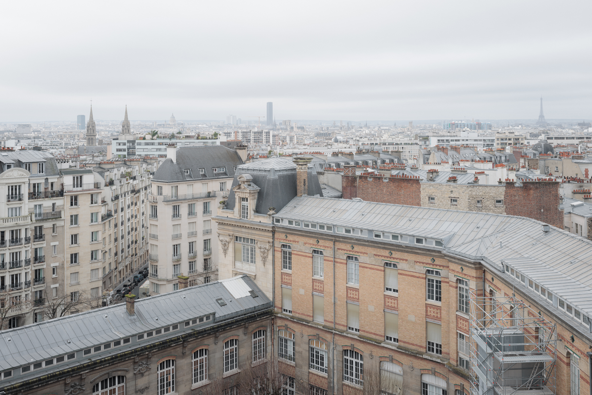 Chaque toit devient le support d’un jardin suspendu. Les étages hauts du bâtiment des années 70 (5ème et 6ème étages) accueillent l’administration de l’école et sont surplombés par la grande terrasse-jardin du huitième étage. Elle devient le point d’orgue du campus depuis lequel