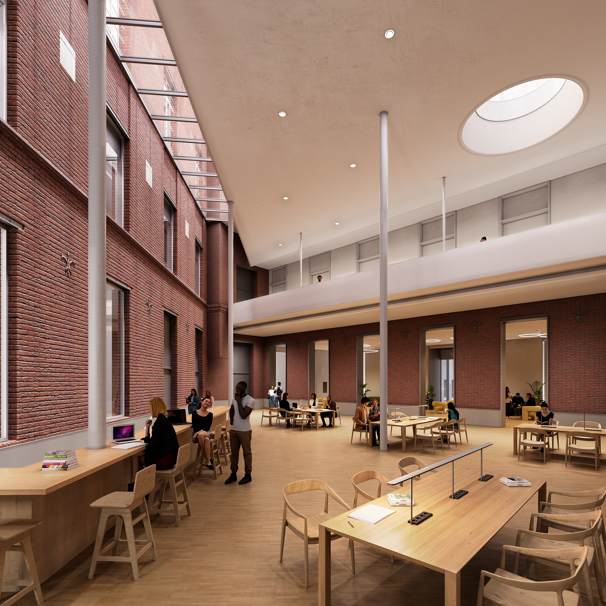 Cette profonde transformation est rendue possible grâce, d’une part, à une refonte de la colonne distributive du bâtiment des années 70, qui permet de gérer maintenant les ruptures de niveaux, et d’autre part, à la création d’une liaison entre les ailes du bâtiment haussmannien. Cette nouvelle structure distributive offre dès lors une plus grande proximité et flexibilité dans les usages quotidiens du Learning-Space et du Work-Space.