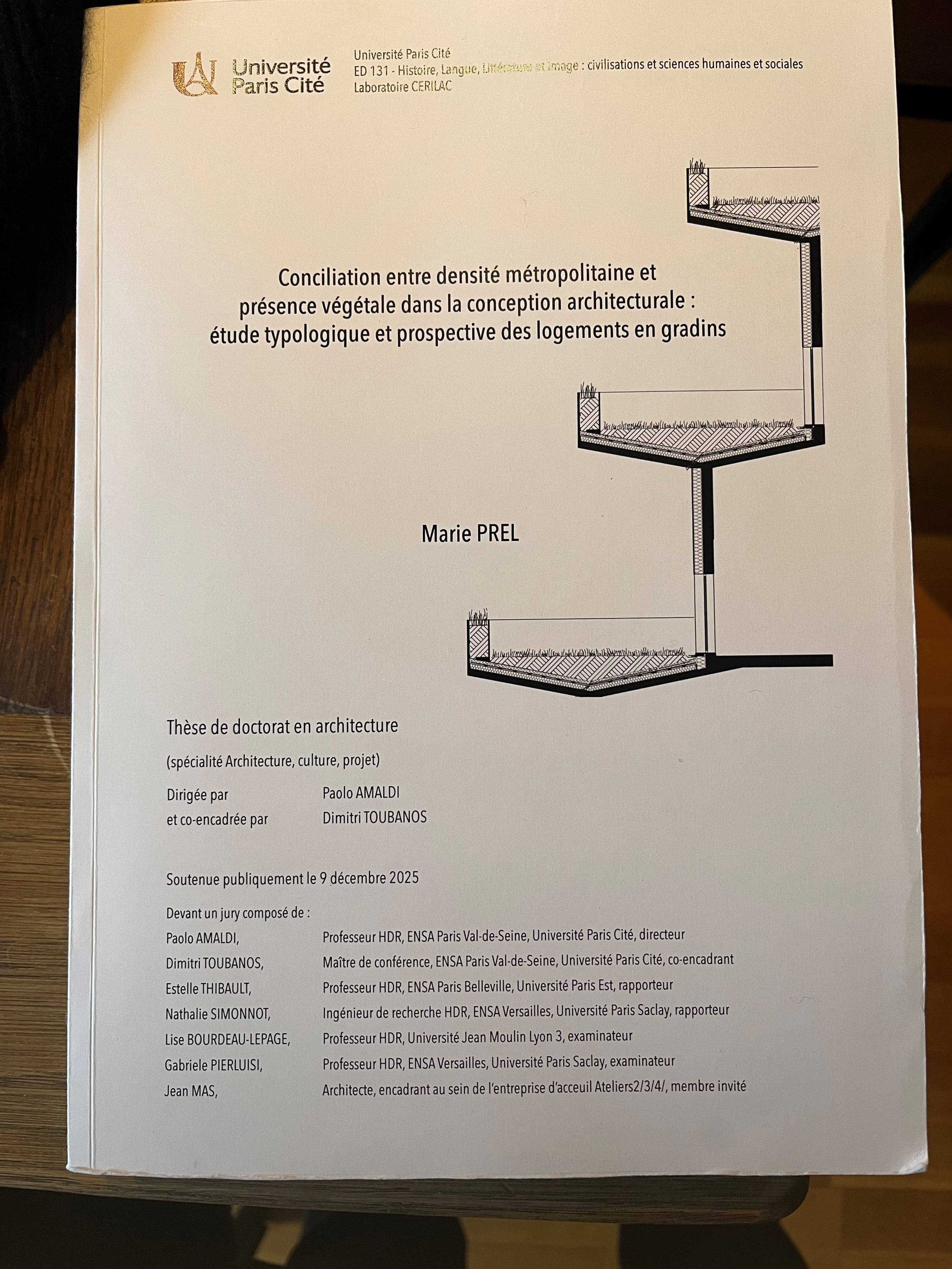 Ateliers 2/3/4/ se félicite du succès de la thèse soutenue par Marie Prel à l’École d’architecture de Paris – Val de Seine le 9 décembre dernier, sous le titre : « Conciliation entre Densité Métropolitaine et présence végétale dans la conception architecturale : étude typologique et prospective des logements en gradins ».