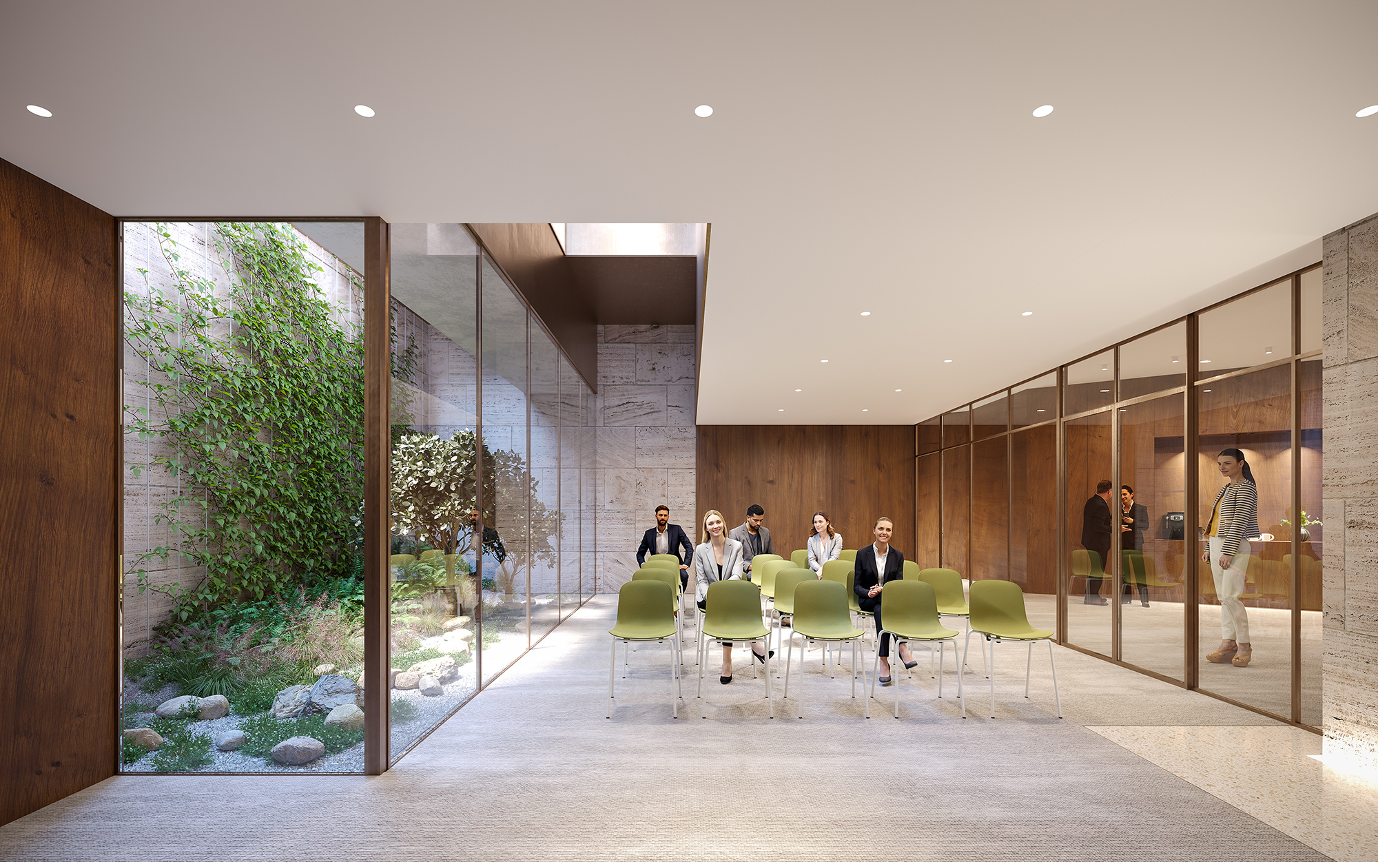 A plant-covered base connecting the building to its surroundings, revealing sober and elegant interiors
