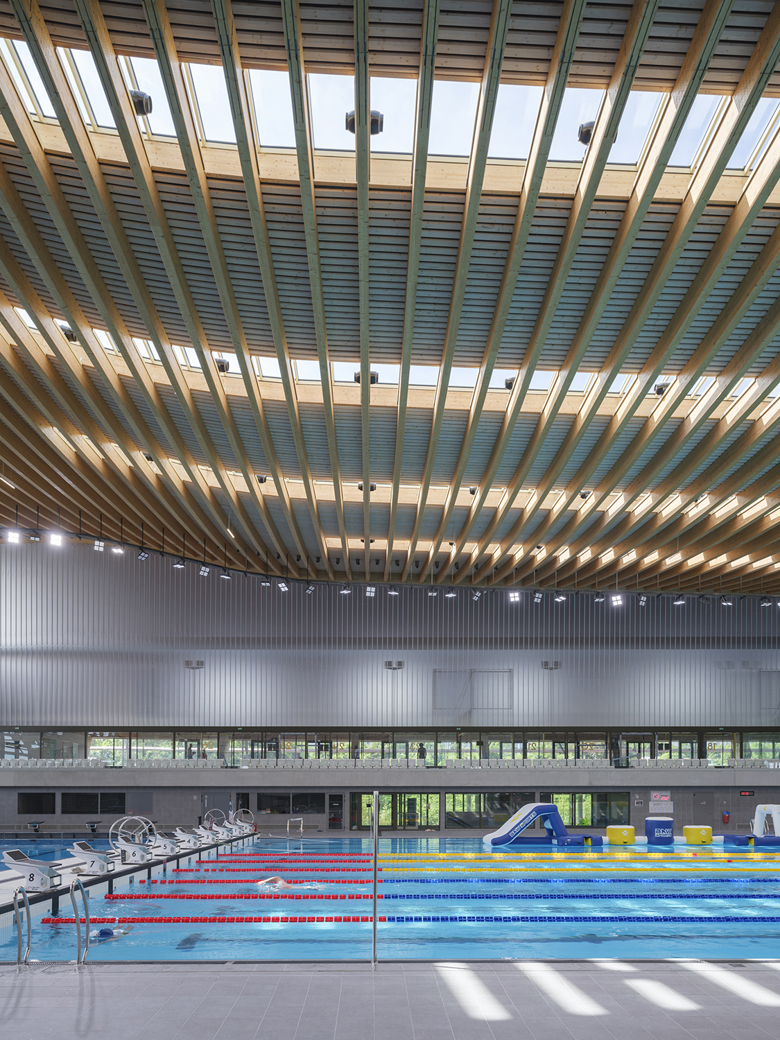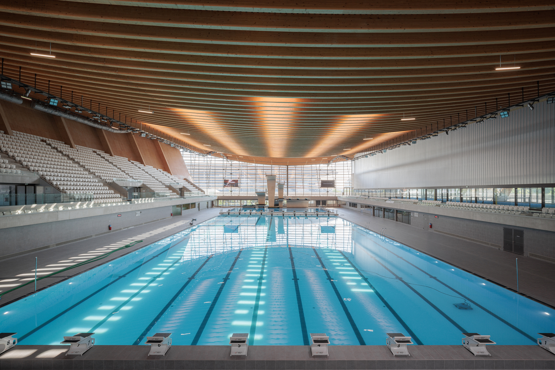 The Aquatics Centre stands out as a demonstration of innovative low-carbon construction thanks to its timber structure, the use of bio-sourced and recycled materials, its energy efficiency and versatility as a sports stadium.
