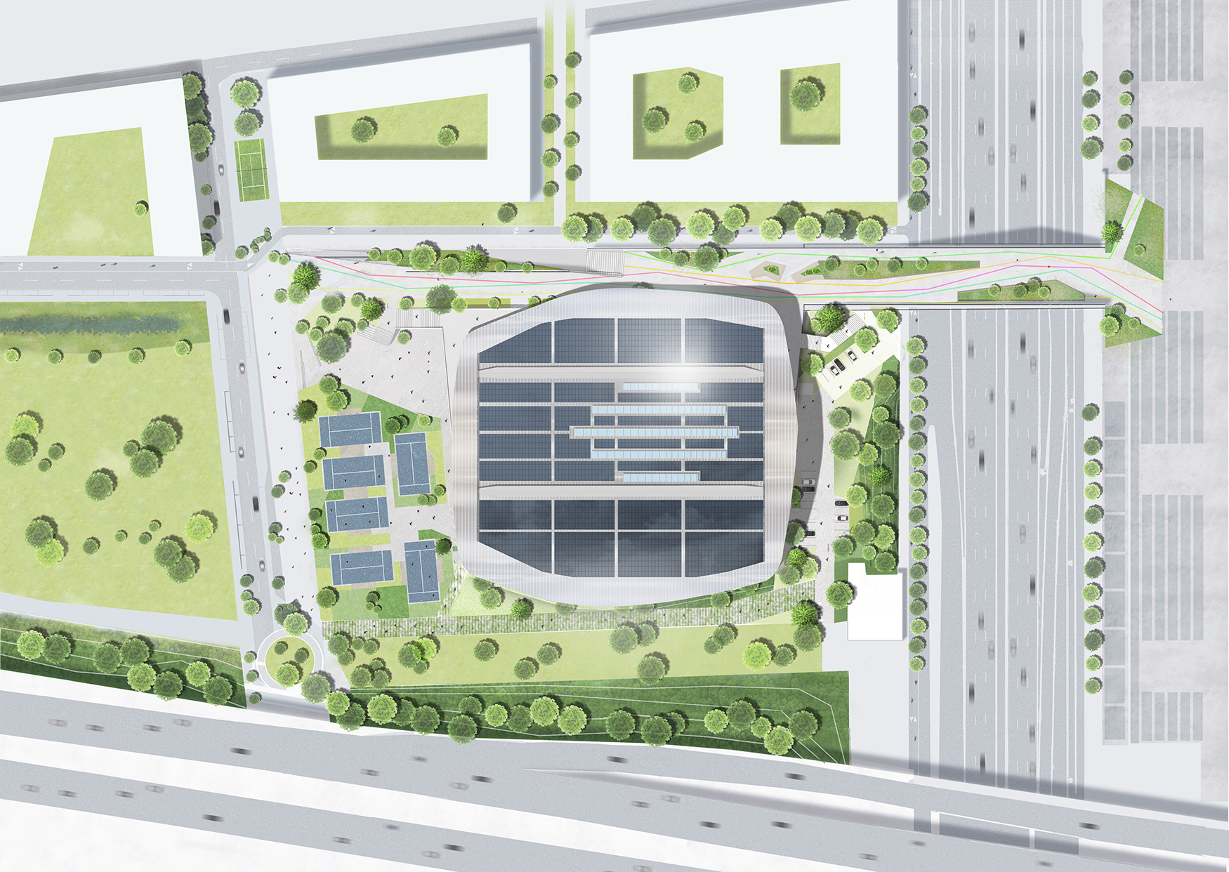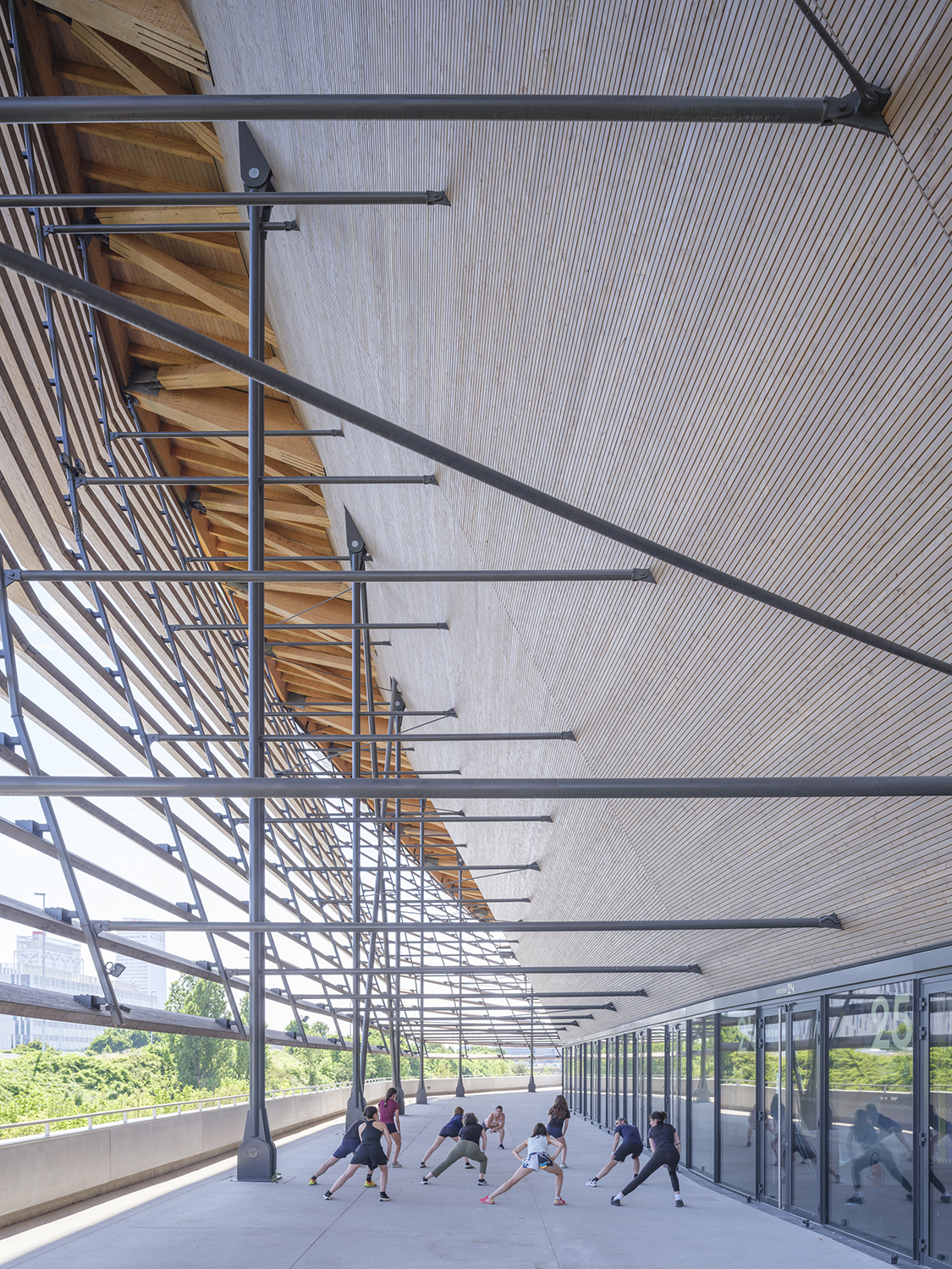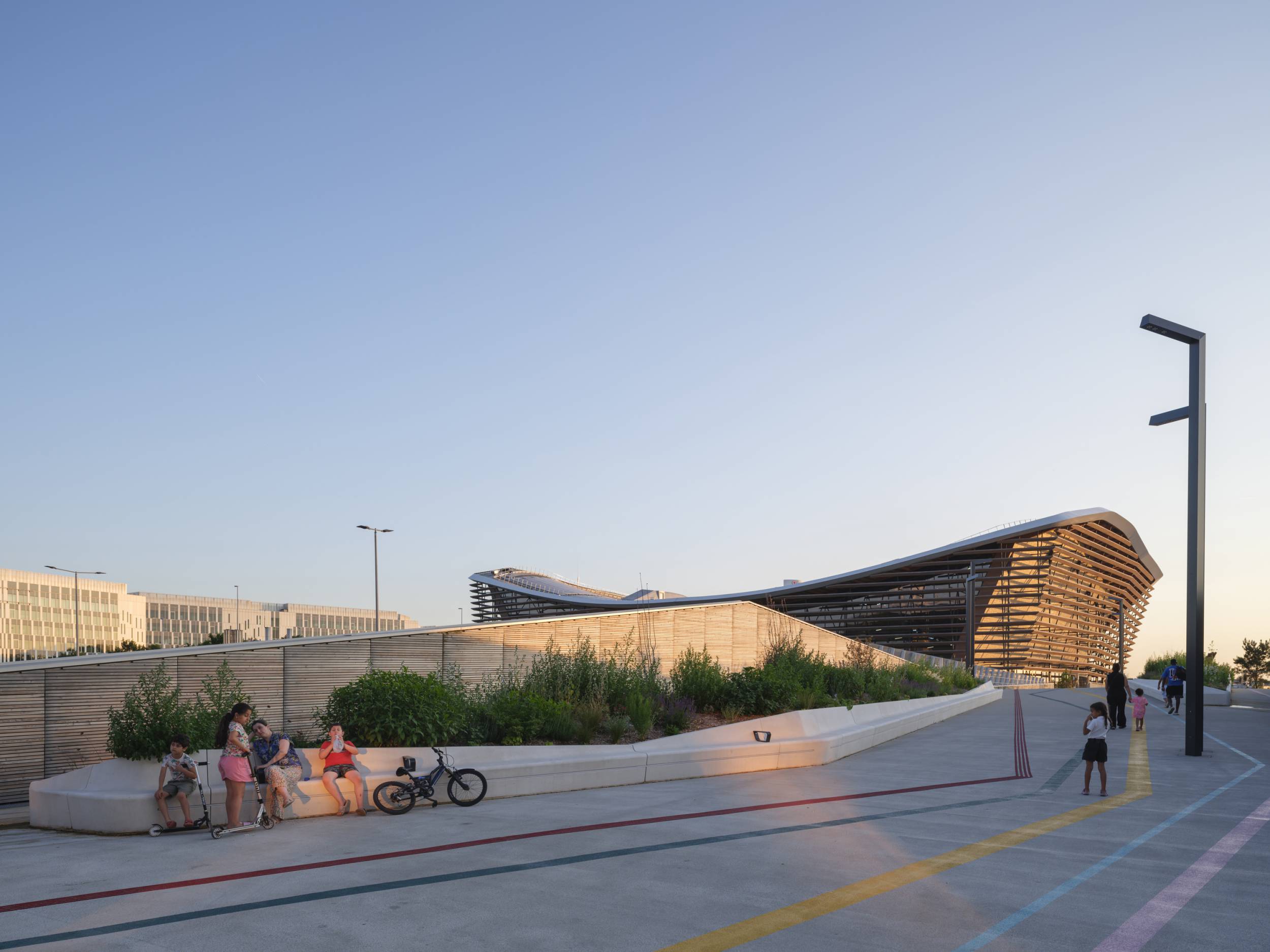 Designed for sports and leisure, the park encourages both physical activity and social interaction. Surrounded by lush vegetation, with 102 trees and shrubs planted in the ground, the Aquatics Centre is linked to the Stade de France with a overpass designed more like a square than a footbridge, which makes it a place of exchange rather than simply a passage. During international competitions, it will be used to manage the flow of spectators; during the heritage phase, it will be landscaped and planted to become a real meeting place and social hub.