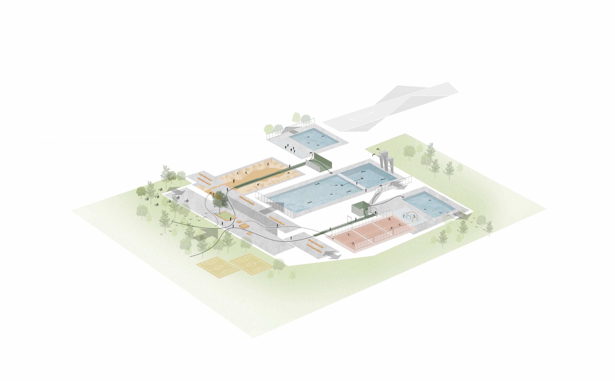 Heritage phase (2025): a public facility with a 50m pool, a diving pool, a 25m learning pool, multipurpose pool, aqua-kids area. When organizing level 1 to 4 competitions: 2500 fixed seats and 2500 temporary seats. Bouldering, restaurant, fitness, 5x5 football.